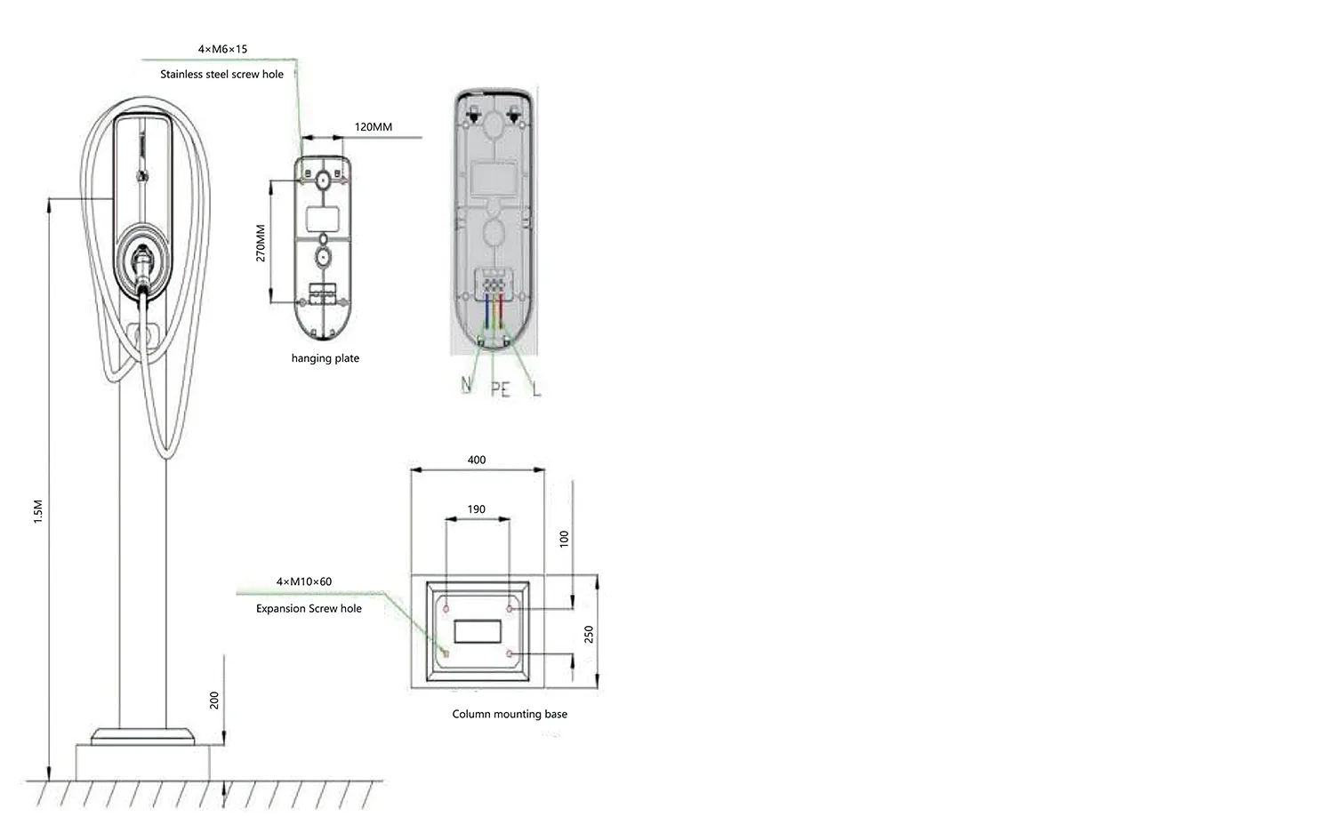 1) Betonfundamentet til ladepælen skal have en styrke på C25. Den underjordiske del er 400 mm, og den overjordiske del er 200 mm. Betonmålene er 400*250mm. Fundamentet skal have et nedgravet udløbsrør i midten, og der skal fastgøres 4 M10*60 ekspansionsbolte på fundamentet.